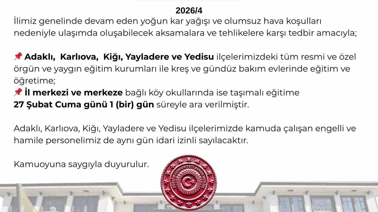 Bingöl Valiliğinin yaptığı açıklamada, 'İlimiz genelinde devam eden yoğun kar yağışı ve olumsuz hava şartları nedeniyle ulaşımda oluşabilecek aksamalara ve tehlikelere karşı tedbir amacıyla; Adaklı, Karlıova, Kiğı, Yayladere ve Yedisu ilçelerimizdeki tüm resmi ve özel örgün ve yaygın eğitim kurumları ile kreş ve gündüz bakım evlerinde eğitim ve öğretime; il merkezi ve merkeze bağlı köy okullarında ise taşımalı eğitime 27 Şubat Cuma günü 1 gün süreyle ara verilmiştir. Adaklı, Karlıova, Kiğı, Yayladere ve Yedisu ilçelerimizde kamuda çalışan engelli ve hamile personelimiz de aynı gün idari izinli sayılacaktır' denildi.