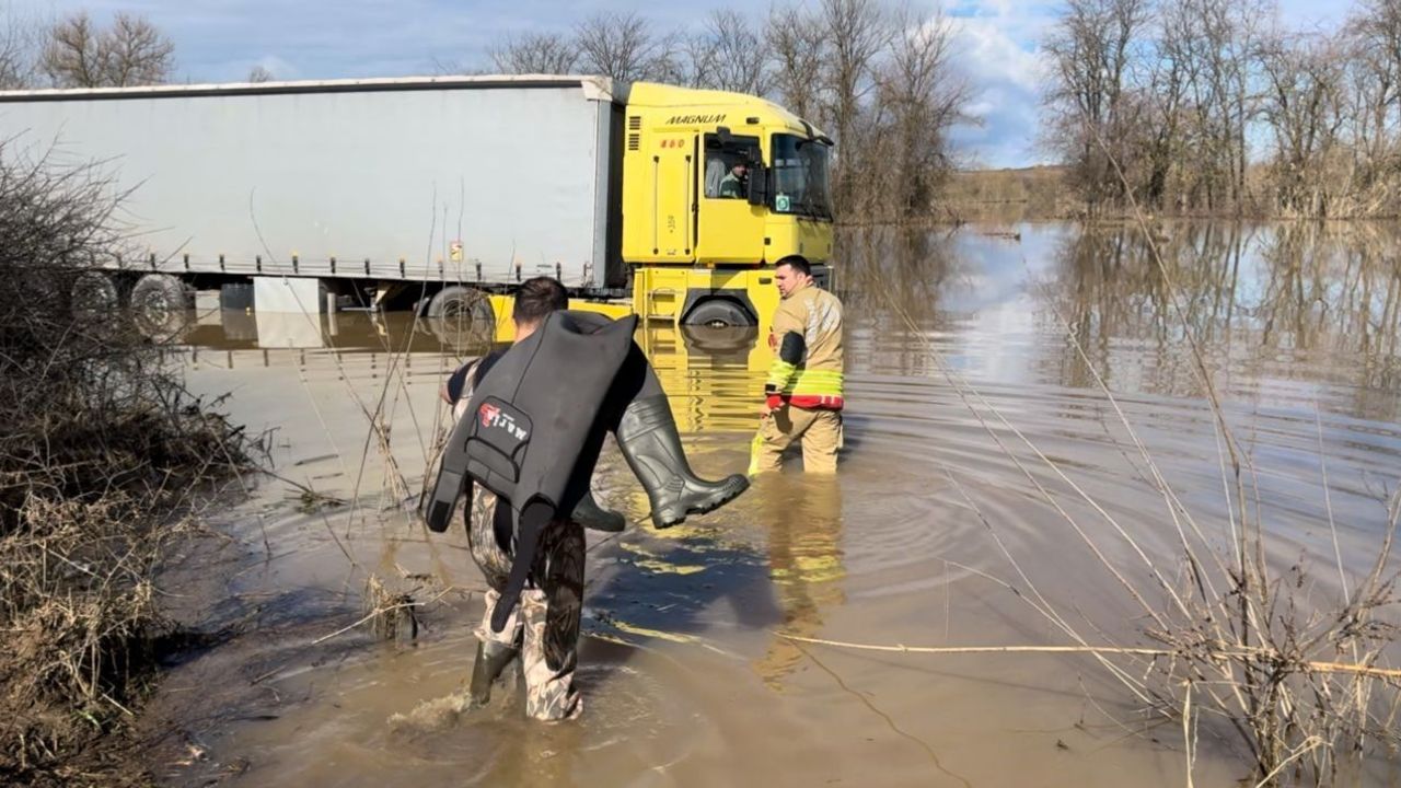 Edirne'de Tunca Nehri'nin taşması sonucu Avarız köyü yolunda tırıyla mahsur kalan Bulgar sürücü, itfaiye ekiplerinin operasyonuyla kurtarıldı.
